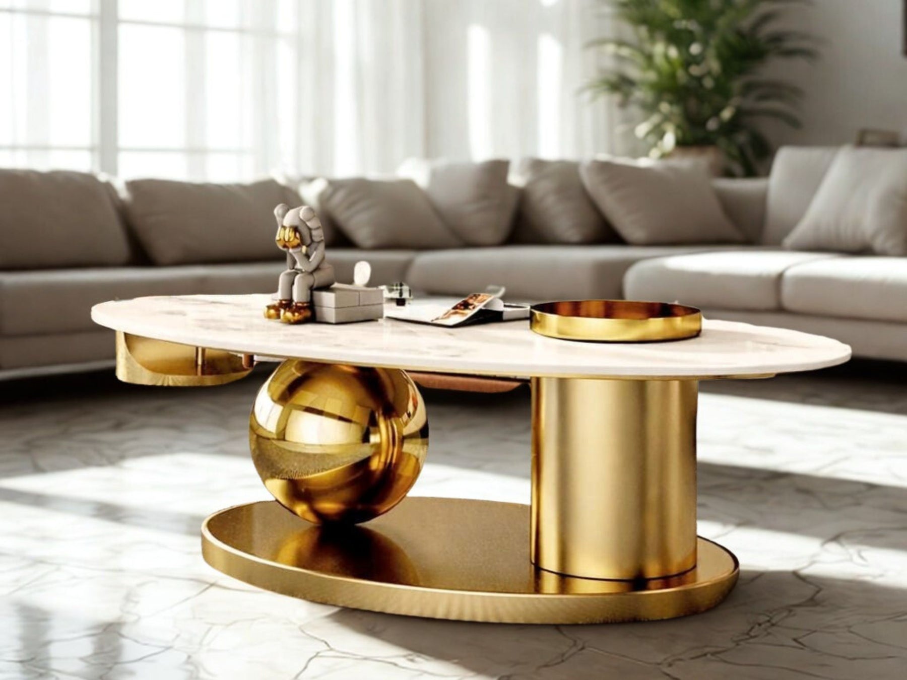 Unlike traditional tables, the Velora uses contrasting geometric forms to create a sense of movement and modern sophistication. The reflective gold base catches the light from every angle, while the elongated oval top provides a spacious, functional surface for hosting and styling.
