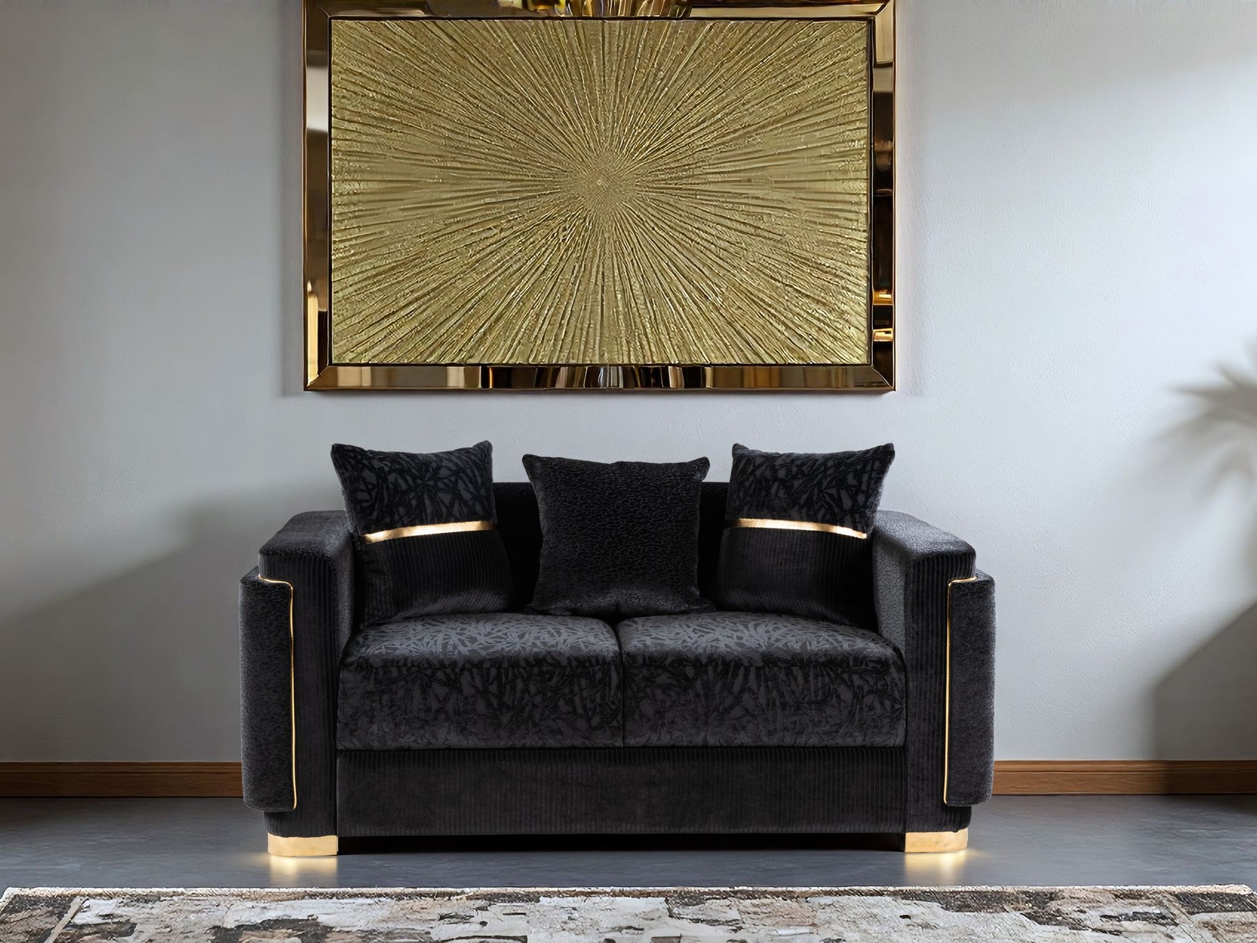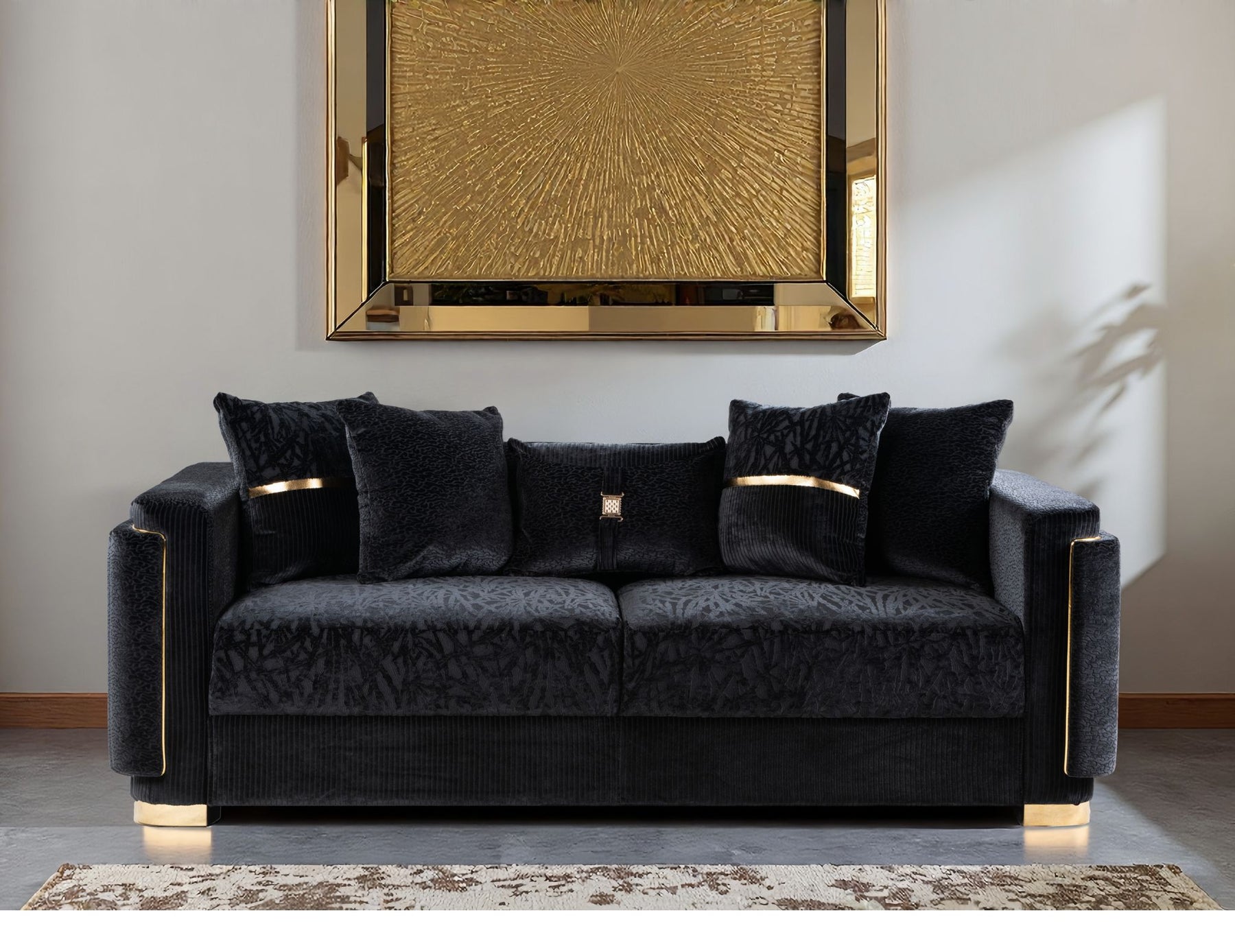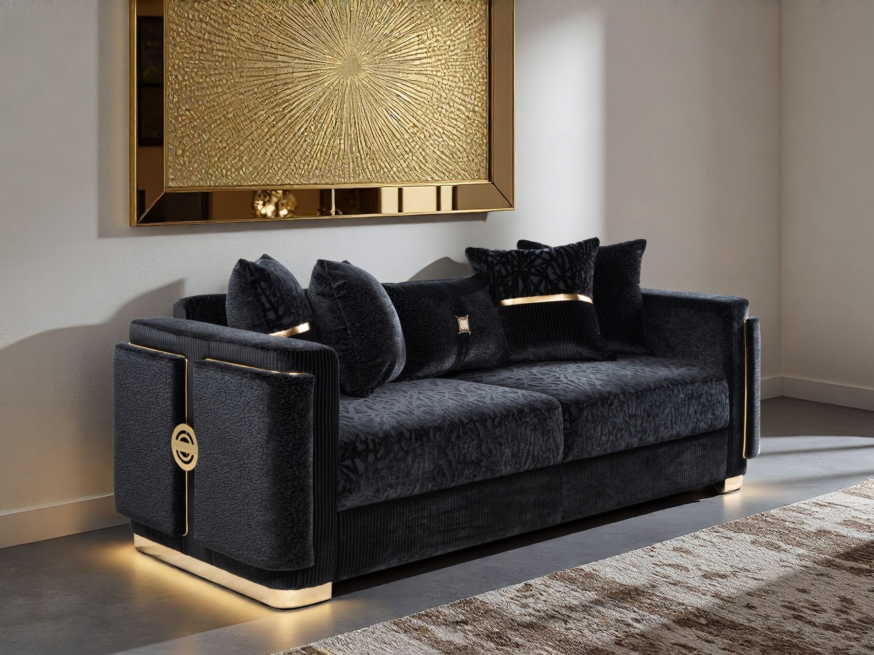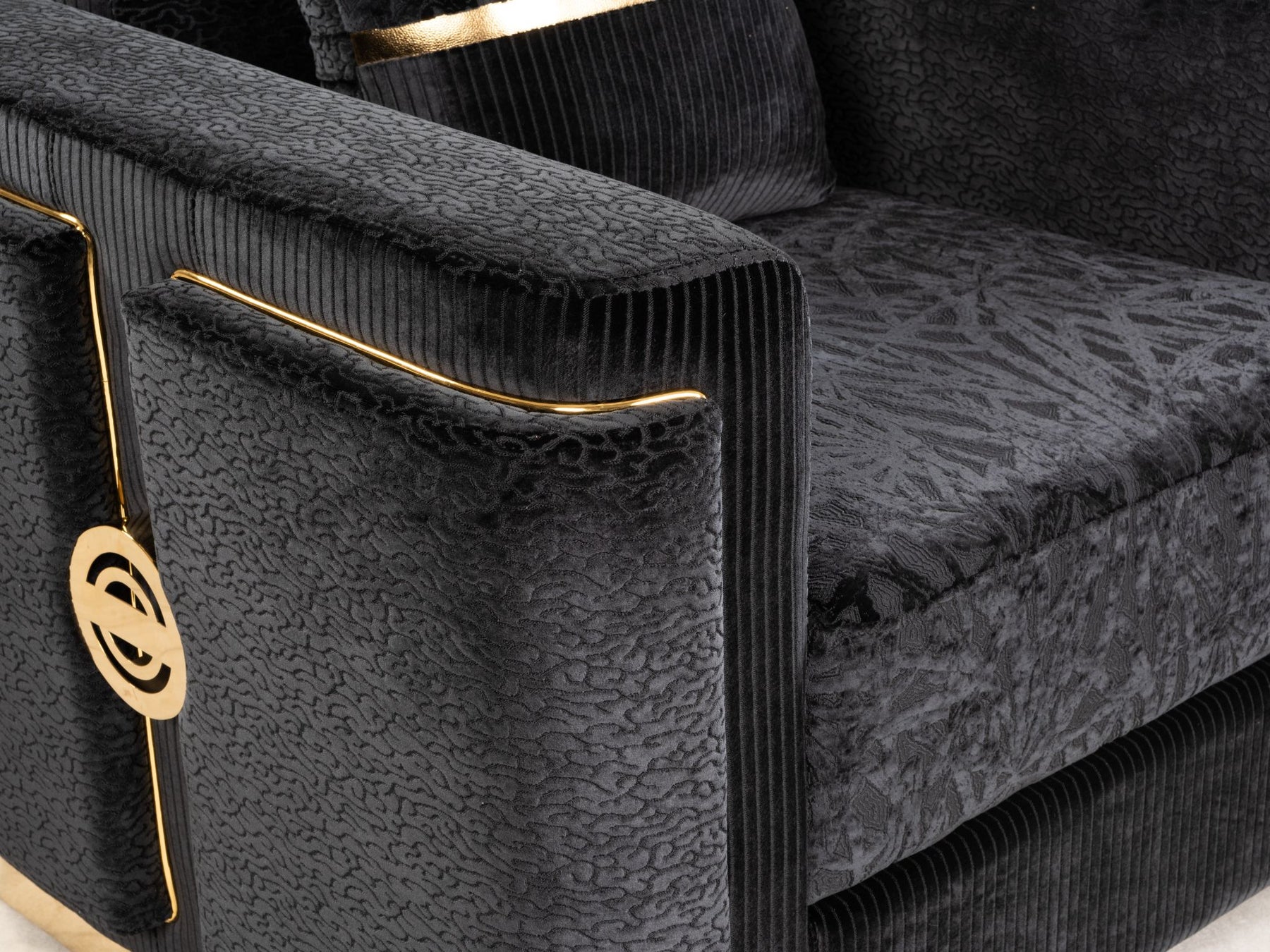 Structured arms and balanced proportions create a sculptural silhouette, while deep seating and supportive cushioning invite relaxation. Refined brushed-gold accents add a quiet touch of luxury, elevating the design without overpowering the space.